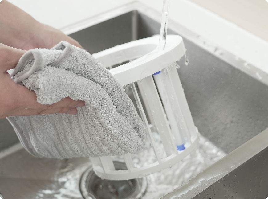 Wash the wick filter by hand or in a front-load washer. For best results, avoid top-load washing machines or dryers.