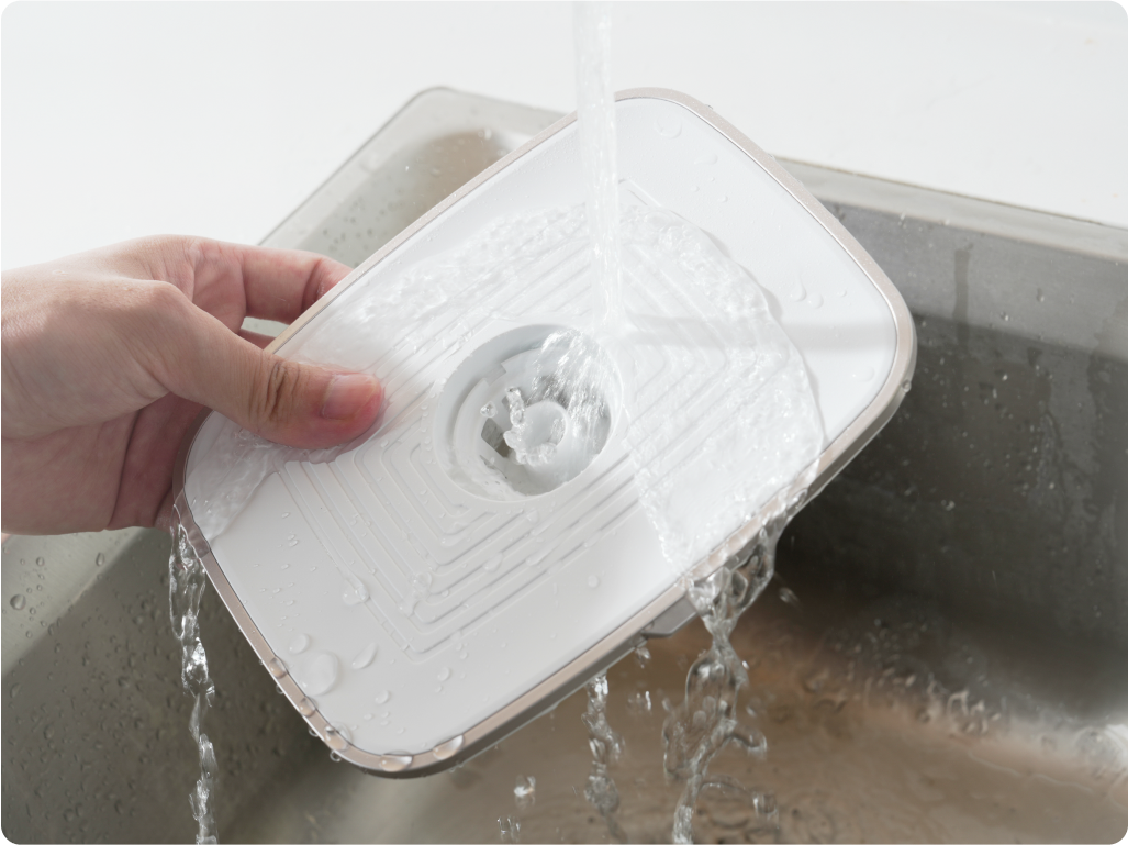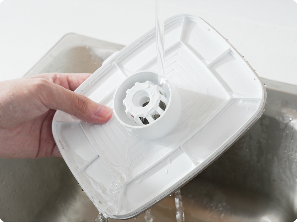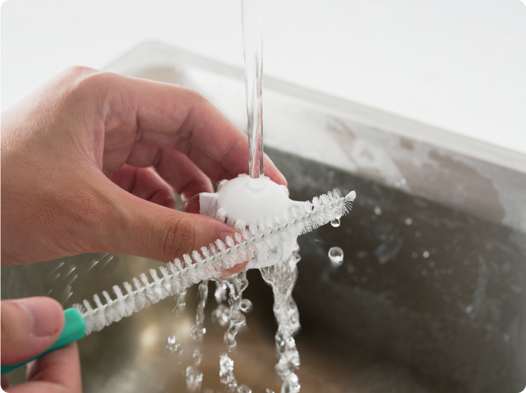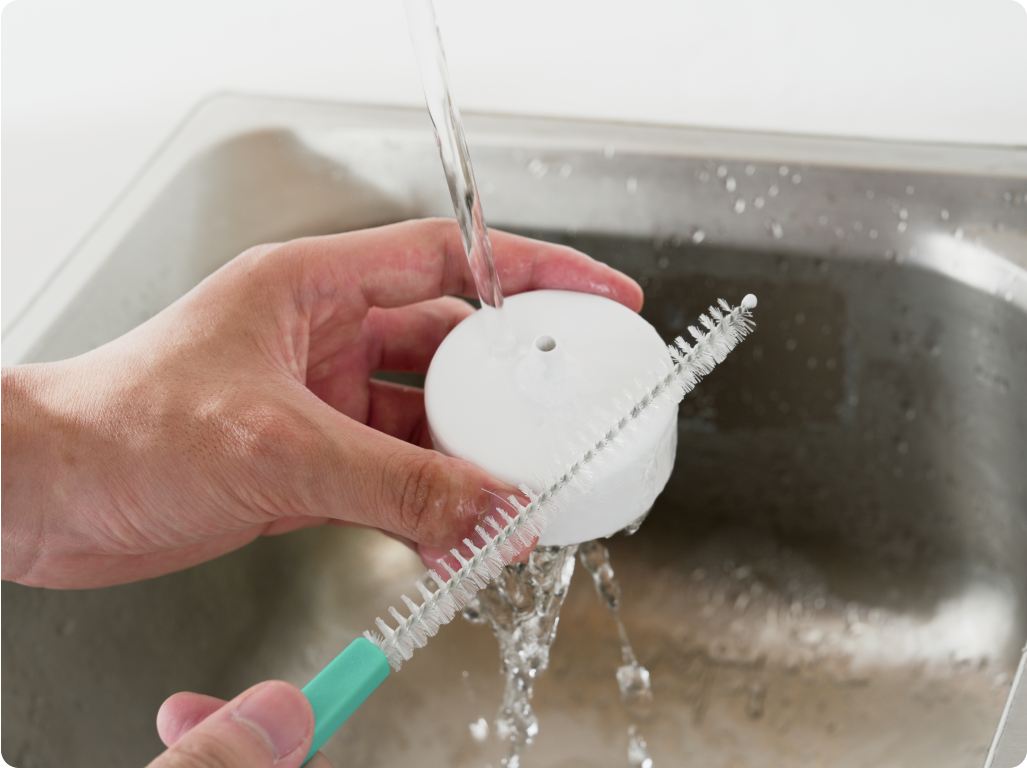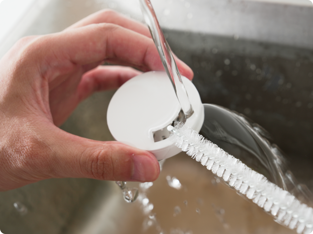 Clean the nozzle with the included cleaning brush. Rinse the top cover with water.