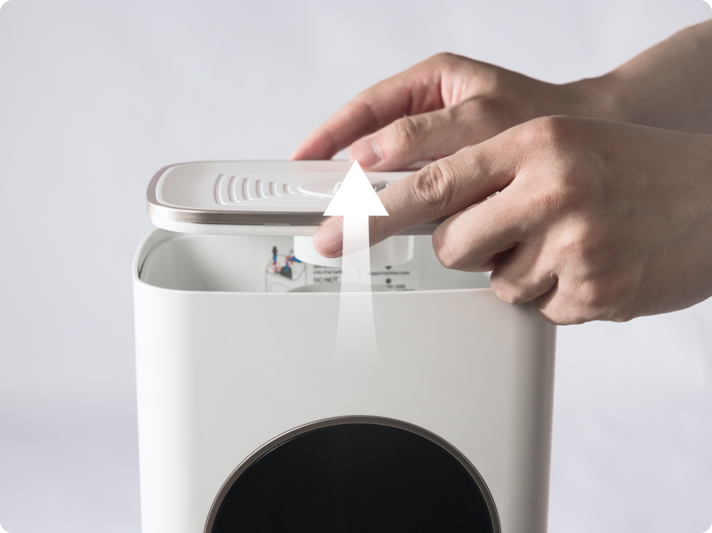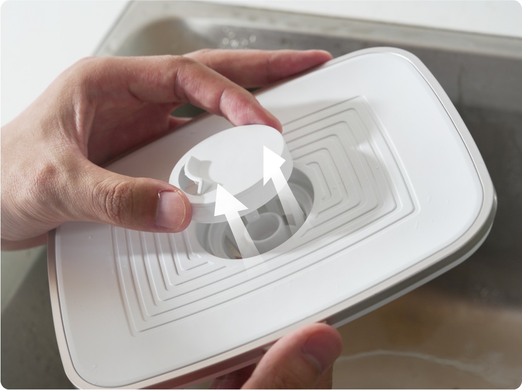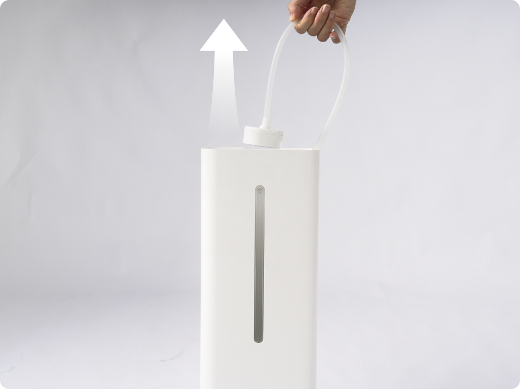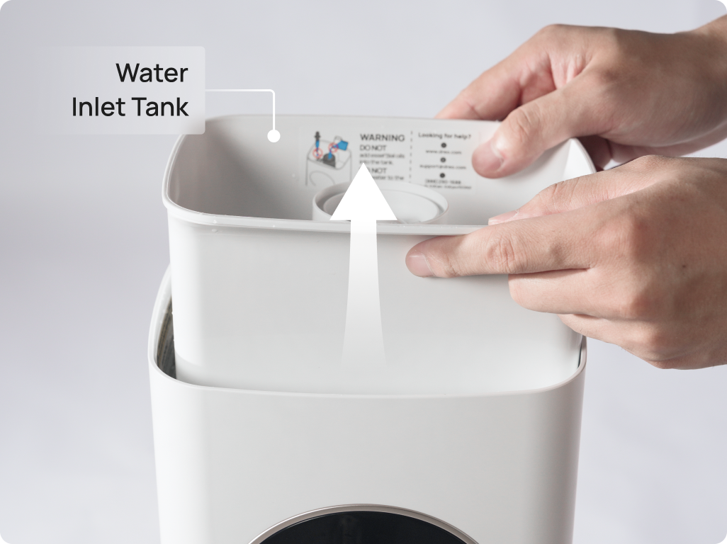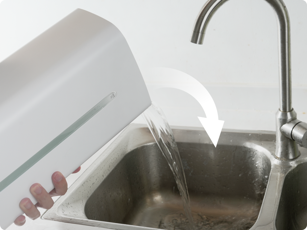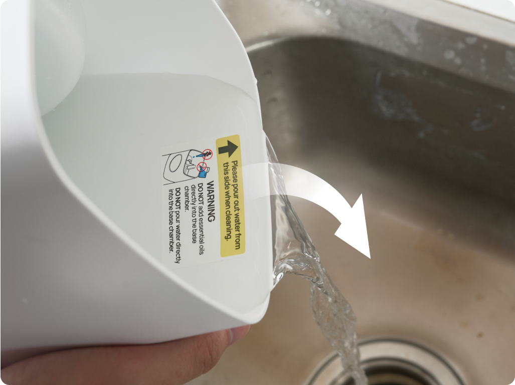 Remove the water inlet tank from the main body. Then pour out the water in the main body and the main water tank. Please follow the POUR THE WATER direction shown in the chamber.
