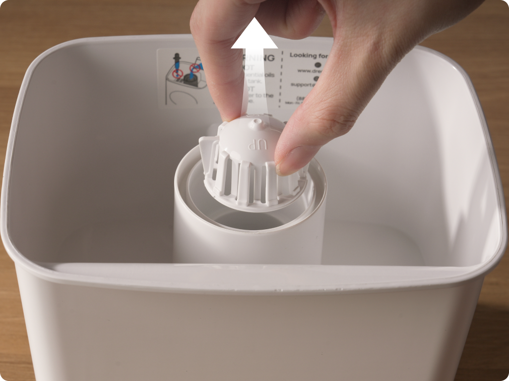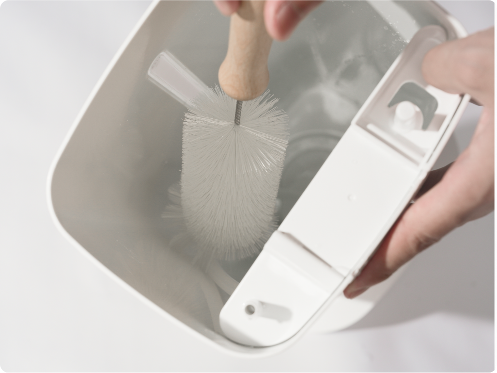 Take out the water cartridge from the main water tank. Then pull to remove it from the water tube. Clean the water tank with an extra bottle brush.