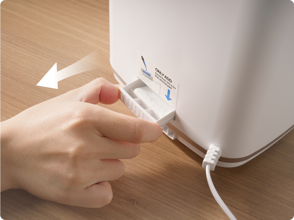 Wipe the main body chamber with a dry cloth. Then remove the aroma pad tray and rinse it with water.